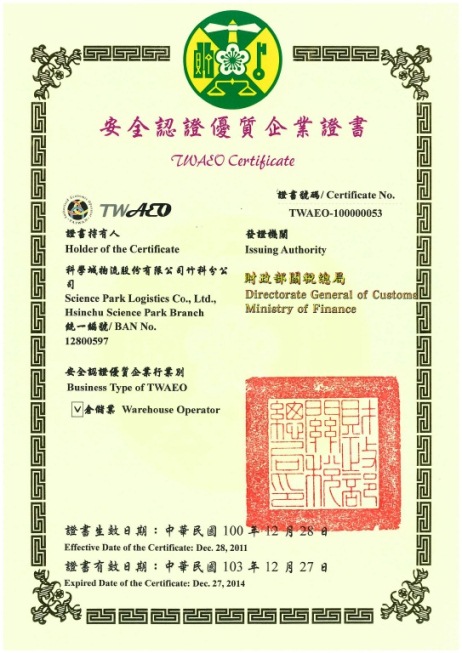 科學城物流竹科分公司於100年12月28日通過財政部關稅總局審核取得倉儲業之AEO安全認證優質企業之認證