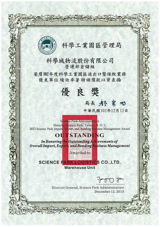 科學城物流竹科分公司於100年12月28日通過財政部關稅總局審核取得倉儲業之AEO安全認證優質企業之認證