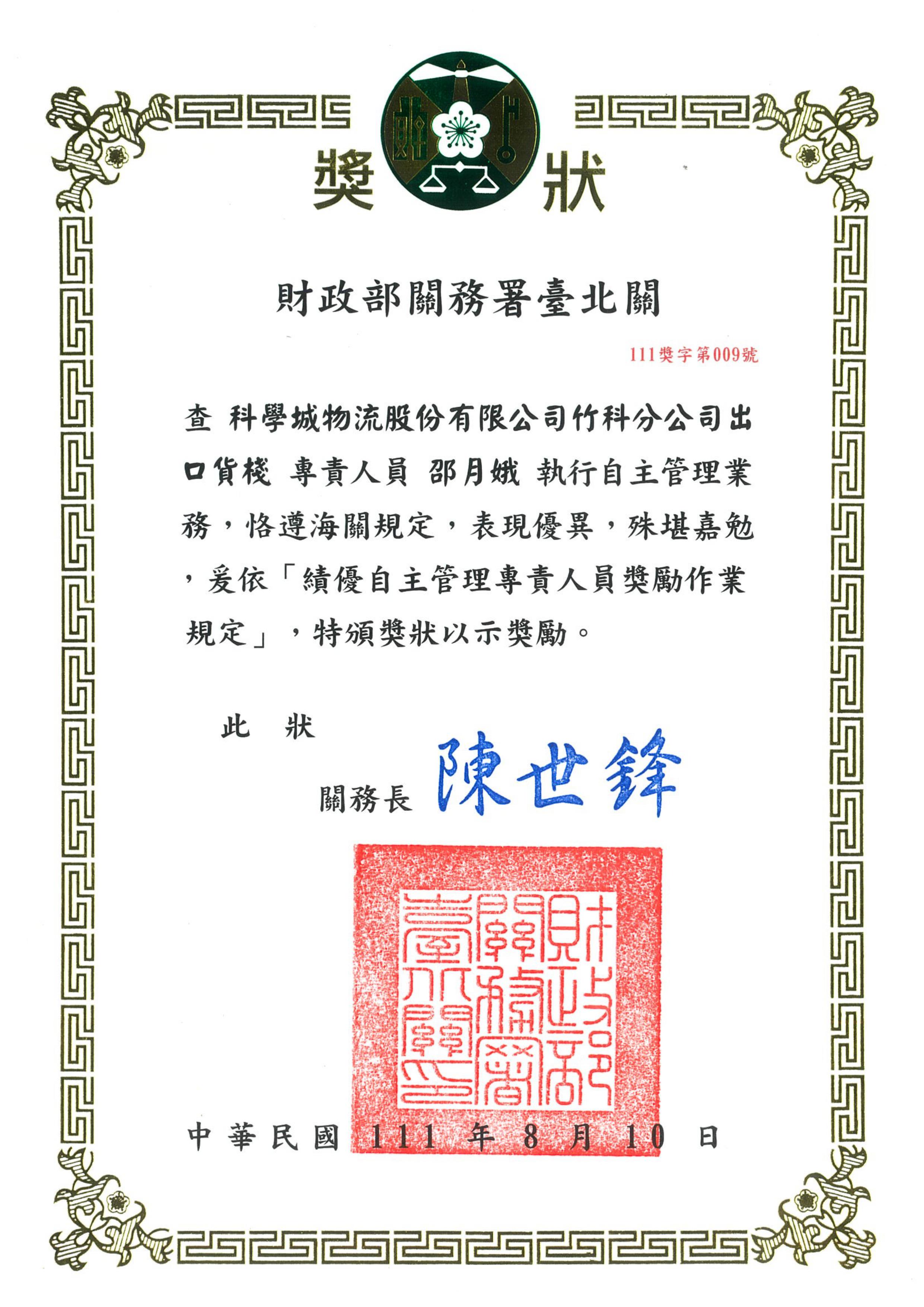 本公司邵月娥榮獲財政部關務署臺北關111年度績優自主管理專責人員