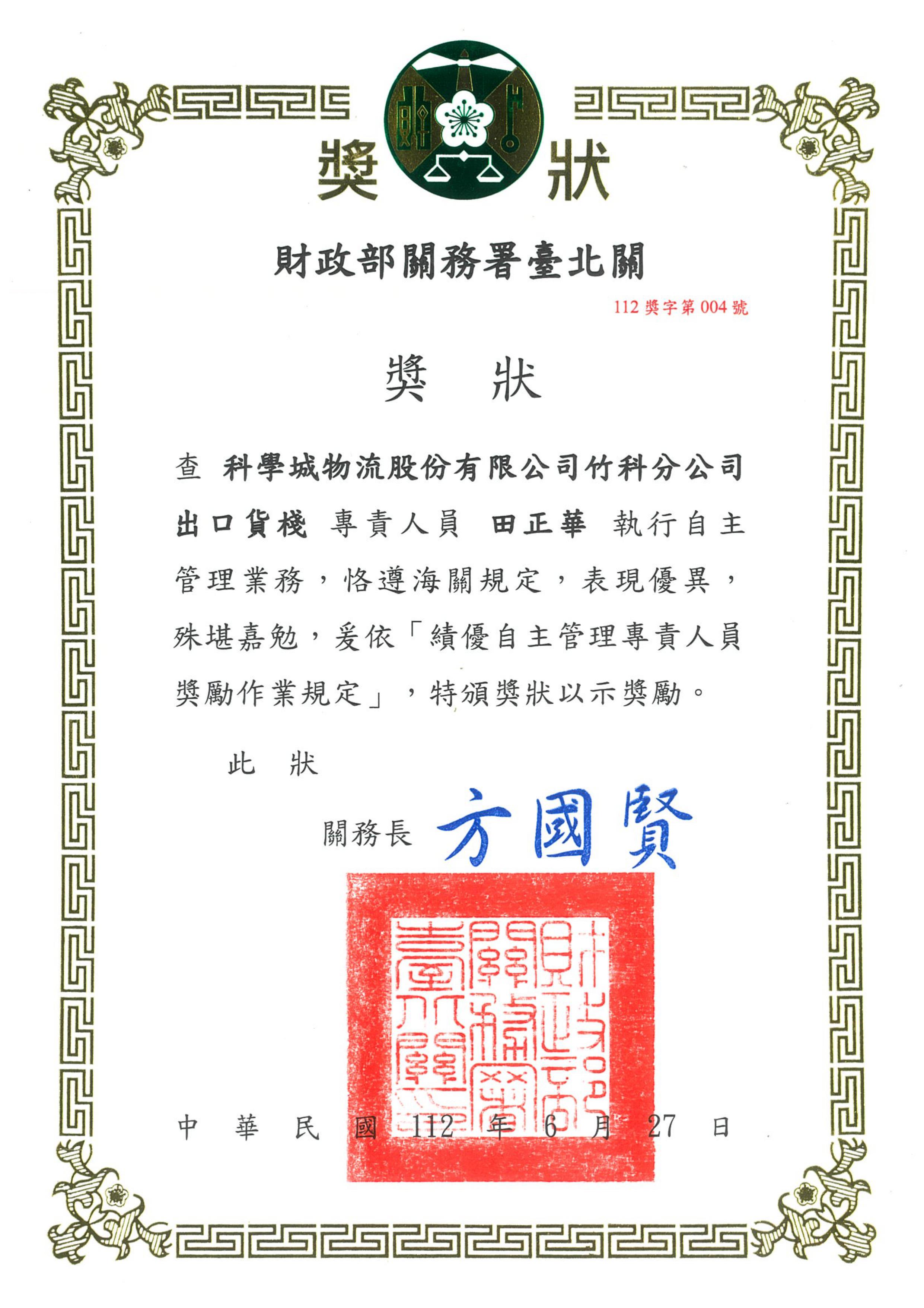 本公司田正華榮獲財政部關務署臺北關112年度績優自主管理專責人員