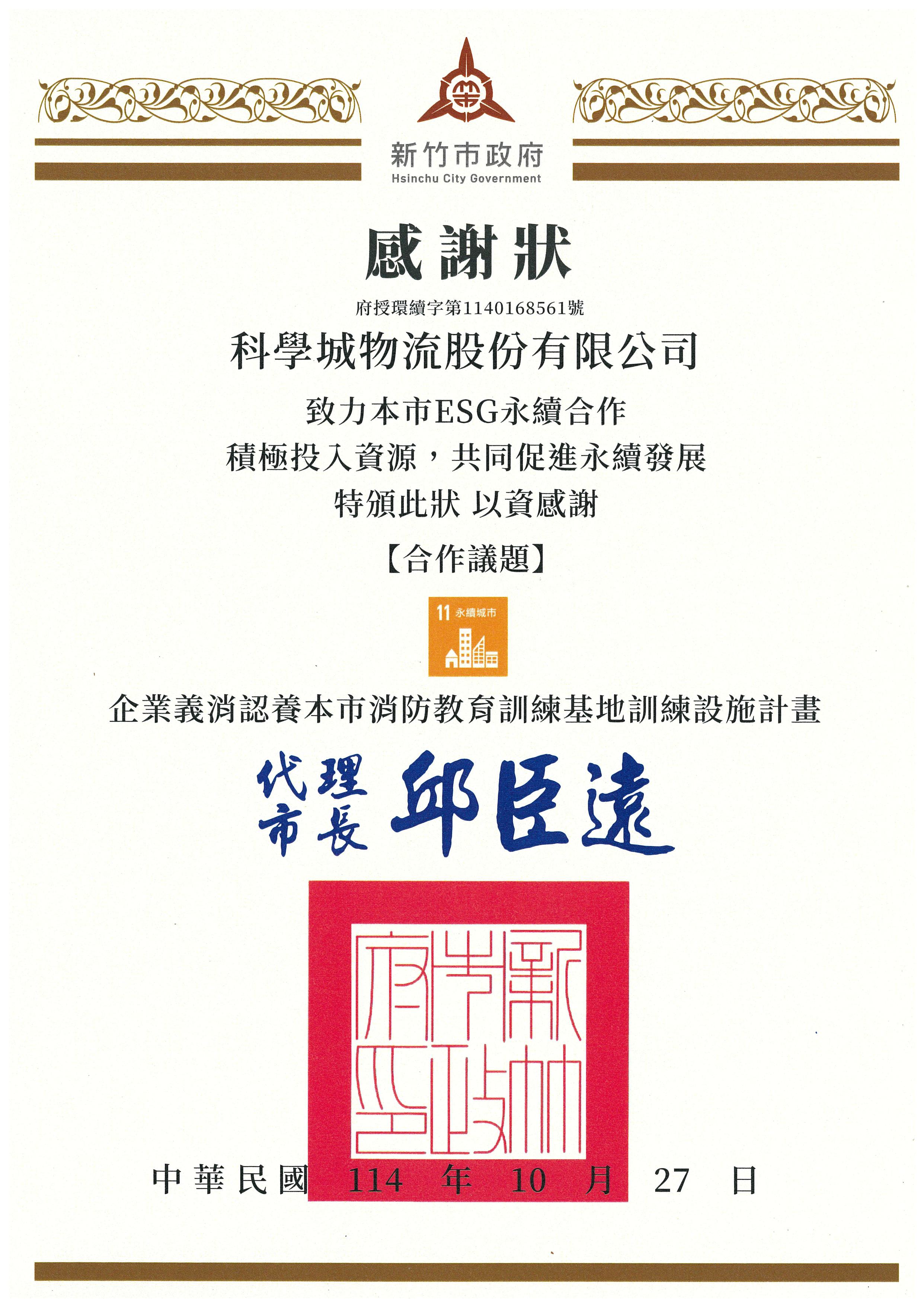 本公司榮獲新竹市政府頒發「ESG永續合作:企業義消認養本市消防教育訓練基地訓練設施計畫」之感謝狀 2025.10.27 SHARE 本公司榮獲新竹市政府頒發「ESG永續合作:企業義消認養本市消防教育訓練基地訓練設施計畫」之感謝狀。